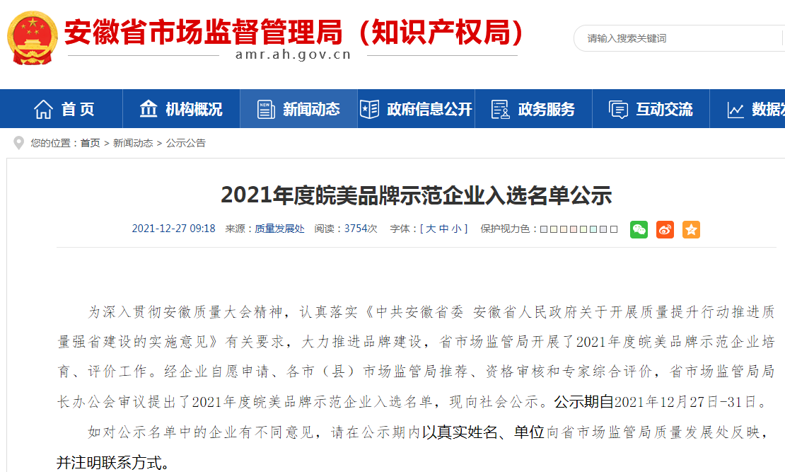 2021年12月27日,安徽省市場(chǎng)監(jiān)督管理局官網(wǎng)公布了2021年度皖美品牌示范企業(yè)入選名單,安徽蘇立科技股份有限公司榮列其中。